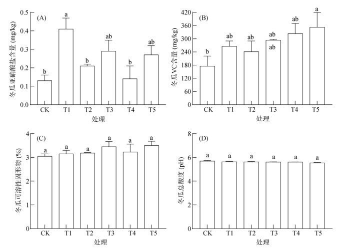 由图 2得出,减氮情况下,与T1相比,添加中微量肥处理的冬瓜品质指标有所改善。T2比T1亚硝酸盐含量降低近一半,T4比T2亚硝酸盐含量降低33%,减肥及添加中微肥处理的亚硝酸盐含量均低于T1(图 2A)。相比于T1处理,T2处理下的VC含量降低了9.31%;T3和T4的VC含量比T2分别提高了0.220倍和0.340倍;T5的VC含量最高,达到了352 mg/kg,较T2和T1分别提高了0.460倍和0.330倍(图 2B)。但是,添加中微肥处理的冬瓜可溶性固形物和总酸度,与未添加处理相比,没有明显变化(图 2C、2D)。