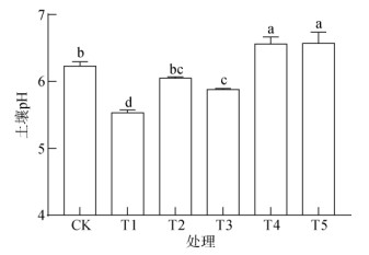 图 3的结果表明,随着施氮量的增加,土壤pH逐渐降低,T1比T2和CK的pH分别降低0.530和0.700单位,而配施中微量元素肥料的T4和T5的pH比T2分别提高了0.510和0.520单位,差异显著(P < 0.05)。