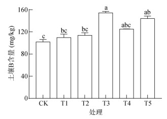 图 4显示,配施微量元素肥后,土壤B含量较未配施处理有升高趋势,T3和T5处理下的B含量比T2分别提高了35.6% 和26.5%,其中T3达到显著水平。