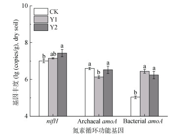 由图 2可知,随着种植年限的增加,健康三七根际土壤中nifH基因的丰度也逐渐增加,其中Y2土样中nifH基因丰度较CK差异显著(P < 0.05),表明根际微生物的固氮能力随三七生长逐渐增强。古菌amoA基因在未种植过三七的土壤中丰度较高,达到3.94 × 106 copies/g(以干土计,下同),随三七种植年限呈现“U”形的变化规律,且Y2较CK无显著差异。细菌amoA基因在CK中的丰度较低,仅为1.07 × 105 copies/g,而三七种植能够大幅度(P < 0.05)提高细菌amoA基因丰度,且其随种植年限的增加变化不显著,Y1和Y2的细菌amoA基因丰度分别是CK的25.7倍和16.1倍,表明三七种植能够显著提高其根际细菌的氨氧化作用。综上,三七种植能够通过提高根际氮素循环功能基因的丰度以增强氮素养分的供应能力,这可能与三七生长过程中对氮的需求不断增加密切相关。