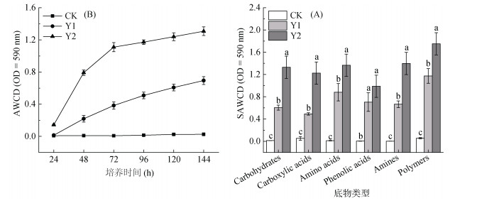 由图 3A可知,在培养24 h后,Y2土样的AWCD值显著(P < 0.05)高于CK和Y1,而Y1和CK间差异不显著,表明Y2的土壤微生物在短时间内即表现出较强的总体碳源代谢活性。随着培养时间的延长,CK的AWCD值仍处在较低的水平,且无明显变化;Y1的AWCD值则呈现逐渐增加的趋势,但增速较为缓慢;Y2的AWCD值在培养前期(24 ~ 72 h)快速增加,随后转为缓慢增加并逐渐趋于稳定,但在培养期内均显著高于Y1。由图 3B可知,在培养144 h以后,CK的土壤微生物对六类碳源的代谢能力均较弱,而三七种植能够显著(P < 0.05)提高根际微生物对六类碳源的代谢活性,且随着种植年限的增加,对碳水化合物类、羧酸类、氨基酸类、胺类和聚合物类碳源的代谢能力显著(P < 0.05)增强,而对酚酸类物质的代谢活性随着种植年限的增加变化不显著。结果表明:未种植过三七的土壤微生物碳源代谢活性很弱,三七种植能够显著提升土壤微生物的碳源代谢功能,且随着种植年限的增加,土壤微生物的碳源代谢功能不断增强。