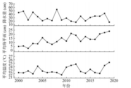 (图中平均气温和平均海平面取5—7月的平均值,而降水量为5—7月的总和) 图 1 2000—2019年季节性气候数据 Fig. 1 Seasonal climate data from 2000 to 2019 |