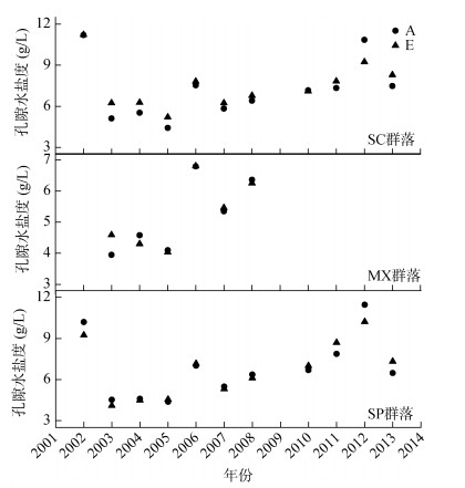 (图例中A为对照处理,E为CO2浓度升高处理) 图 2 2002—2013年SC、MX、SP群落20 cm深度处孔隙水盐度生长季(5 – 7月)变化 Fig. 2 Changes of porewater salinity at 20 cm of SC, MX and SP communities in growth season (May-July) from 2002 to 2013 |