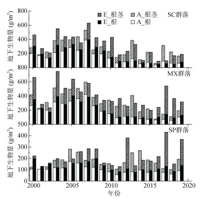 图 3 2000—2019年SC、MX、SP三个群落根茎、根生物量变化和总地下生物量的变化 Fig. 3 Changes of rhizome, root biomass and total underground biomass of SC, MX and SP communities from 2000 to 2019 |