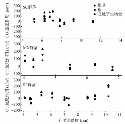2.4 盐度对CO2施肥作用的影响盐度的变化会影响湿地SC和MX群落中根茎、根和总地下生物量对CO2浓度升高的响应。在盐度较低的年份中,CO2浓度升高对根茎、根和总地下生物量的影响较高,在盐度较高的年份中,CO2升高对根茎、根和总地下生物量的影响较低,盐度与CO2施肥作用呈负相关。而在SP群落中,盐度的升高对CO2施肥作用没有明显影响,CO2施肥作用较为稳定(图 4)。