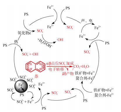 活化过硫酸盐氧化反应原理主要是SO4–·与PAHs通过电子转移和加成反应进行氧化。如图 3所示,过硫酸盐在Fe2+等活化条件下,对萘的氧化途径可能是自由基先在α或β位攻击萘环生成羟基化产物,而后进一步发生羰基化、加氢甲酰化或羧基化生成中间产物[29]。