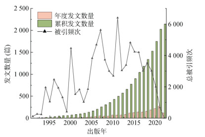 图 1 年度发文数量与累积发文数量及被引频次 Fig. 1 Numbers of annual and cumulative publications and frequency of citations |