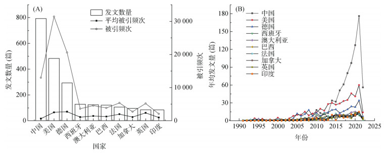 图 2 排名前10位的国家的发文数量与被引频次(A)及其1991—2022年的年发文量(B) Fig. 2 Number of papers and citations of top 10 countries (A) and annual number of papers published in 1991—2022 (B) |