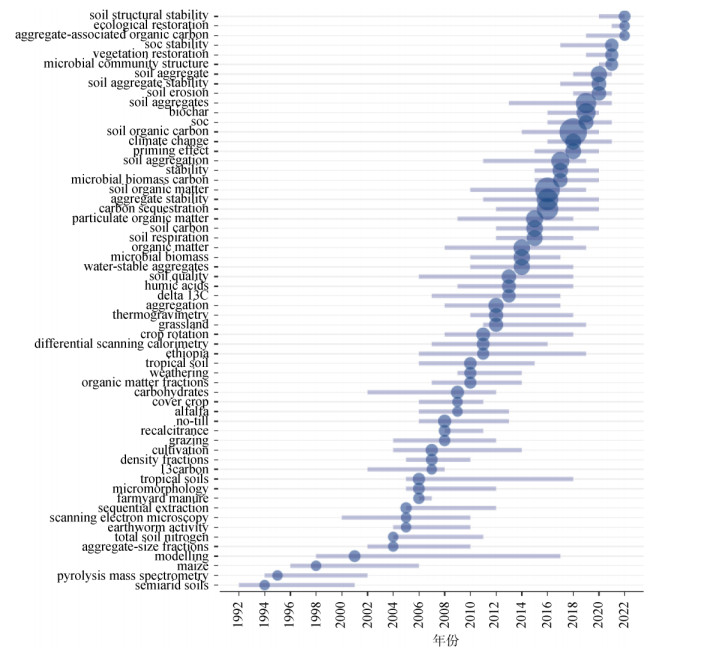 图 6显示了1991—2022年土壤有机碳稳定性研究的主题趋势。由图 6可知,频率最高的词(以2018年最大的气泡表示)为土壤有机碳,使用频率为308。土壤团聚体是2020年和2021年土壤有机碳稳定性研究中讨论最多和最具趋势的话题。对土壤有机碳稳定性研究感兴趣的研究人员,可持续关注土壤团聚体对有机碳的物理保护、矿物介导的化学保护和土壤微生物间的强烈相互作用,进一步挖掘土壤有机碳稳定的机制。图 6还表明土壤有机碳稳定性的研究涵盖了土壤结构稳定性、生态恢复、气候变化、团聚体相关碳、微生物群落结构等多个领域,且近年来关键词数量不断增加,并在2016年左右达到顶峰,这意味着土壤有机碳稳定性的研究视角迅速拓展。