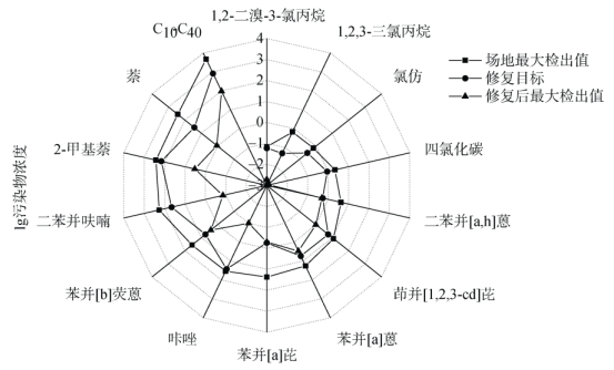 综合两次数据分析结果,本地块基坑清挖效果达到标准。进行常温解吸和热脱附后的土壤样品中各污染物最大检出值均低于修复目标值,符合修复治理要求,无需继续修复。各污染物修复效果如图 4所示。修复后的土壤可以进行再次利用,一定程度上控制了土壤资源流失。