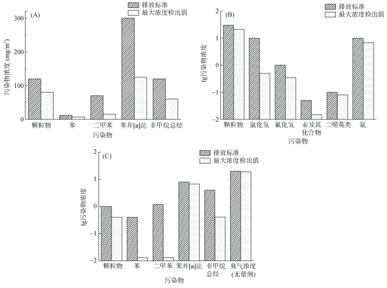 (A. 常温解吸和热脱附尾气;B. 水泥窑尾气;C. 无组织废气;其中,苯并[a]芘、汞及其化合物的浓度单位为ng/m3) 图 5 各监测项目浓度对比 Fig. 5 Comparison of concentrations of each monitoring item |