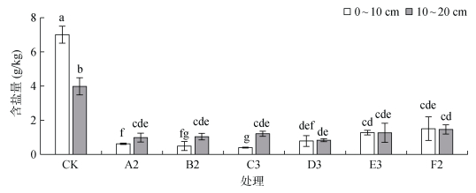 图 2 不同改良物料最佳用量处理下的土壤含盐量 Fig. 2 Soil salt contents under different treatments |