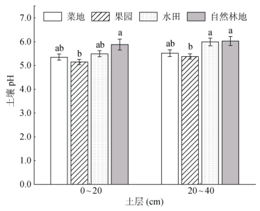 菜地、果园、水田和自然林地表层和表下层土壤pH存在显著差异(图 2)。在两个土层深度条件下,果园土壤pH均显著低于自然林地土壤(P < 0.05);果园表下层土壤pH显著低于水田土壤(P < 0.05);菜地表层与表下层土壤pH与其他利用方式的土壤间无显著差异。