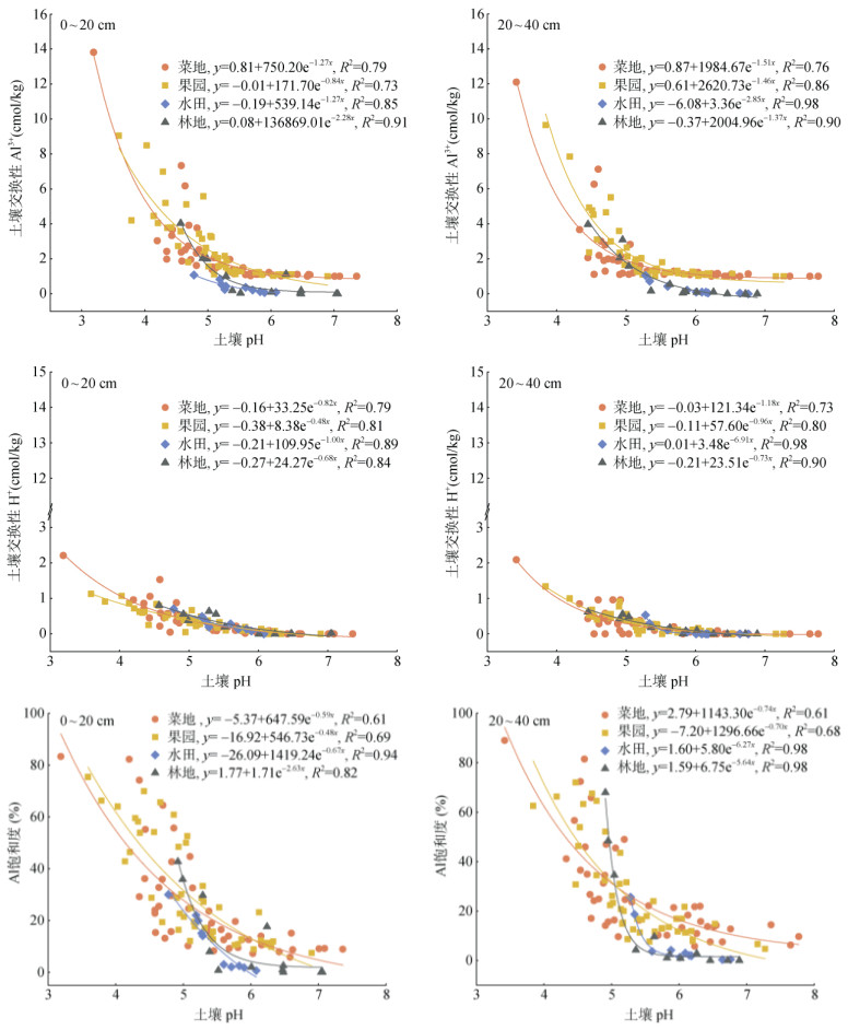 4种土地利用方式下表层和表下层土壤pH均与交换性酸(Al3+和H+)之间存在极显著反指数关系(P < 0.001)(图 4)。当土壤pH < 5.5时,土壤交换性Al3+随着土壤pH的降低而迅速增加;同时,Al饱和度也随着土壤pH的升高而呈指数下降趋势。菜地和果园表层和表下层土壤Al饱和度均值在25% ~ 35% (图 3),且菜地和果园土壤Al饱和度均显著高于水田(P < 0.05)。