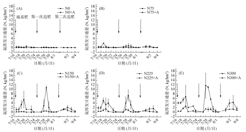 3次施肥相比较,施基肥后,各施肥处理NH3挥发日通量随时间发生波动,约经过8 d才恢复至与空白对照相当;而第一次追肥后,各施肥处理NH3挥发日通量经过约6 d后恢复至与空白对照相当;第二次追肥后,各施肥处理NH3挥发日通量的恢复经过约4 d,用时较短。同时第一次追肥后各施肥处理的NH3挥发日通量明显高于施基肥后,施基肥后各处理的NH3挥发日通量明显高于第二次追肥后。3次施肥后,H0组的N300处理均达到最大峰值,其次为H0组的N150与N225处理,3个处理的最大峰值分别为10.7、7.3、10.9 kg/(hm2·d),且这3个处理峰值明显高于其他处理。NH3挥发日通量较低的N0、N0+A、N75、N75+A、N150处理在3次施肥过程中没有较大变化,均少于1.0 kg/(hm2·d)。
