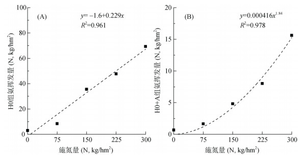 图 2 H0组(A)与H0+A组(B)氨挥发总量与施氮量的拟合曲线 Fig. 2 Fitting curve between total ammonia volatilization and nitrogen application in group H0 (A) and group H0 + A (B) |
