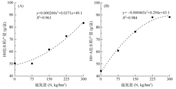 如图 4所示,H0组中水稻产量与施氮量二者拟合曲线为二次函数y=0.000 269x2+0.037 1x+49.1 (R2=0.961);H0+A组中二者拟合曲线为二次函数y= –0.000 465x2+0.296x+43.1(R2=0.991)。