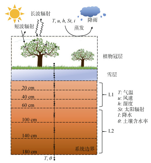 1.3 模型描述SHAW模型为一维水热耦合模型,最初是由Flerchinger和Saxton[4]在1989年建立,并用于模拟土壤冻融过程中热量、水量、溶质通量的耦合迁移运动,模型的基本原理如图 1所示。本研究采用SHAW模型模拟冬季实验场内积雪覆盖条件下的土壤垂向剖面水热动态迁移过程,并探究输入参数对土壤温度以及冻结深度输出结果的影响。模型要求输入的信息包括:积雪、土壤温度和土壤含水量的初始状态;每日或每时的气象资料(气温、风速、湿度、降水和太阳辐射);模拟地点的位置概况(坡度、坡向、纬度和表面糙率参数)以及描述积雪、土壤剖面物理特征的参数[14]。本研究选用2013年12月份的每日气象资料作为驱动,同时输入初始时刻的积雪特性参数(雪厚、雪温、雪密度)与初始、结束时刻的土壤温度的实测值。模型将土壤剖面划分为6个土层(0 ~ 20、20 ~ 40、40 ~ 60、60 ~ 100、100 ~ 140、140 ~ 180 cm),每层由一个节点表示,并根据前期土壤颗粒分析结果建立两层系统,即0 ~ 20、20 ~ 40、40 ~ 60 cm为L1,60 ~ 100、100 ~ 140、140 ~ 180 cm为L2。将土壤特性参数分别视为一致输入模型。模拟时间为当年12月2日(第336天)至12日(第346天),输出时间步长为24 h。