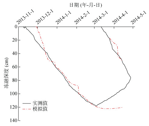 2 结果与分析将自然积雪边界参数输入模型,得到2013年11月29日至2014年4月15日的土壤冻结融化深度、温度的模拟结果,其中实测值的观测时间为2013年11月1日至实际融通时间。