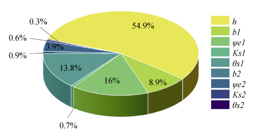 (图中h表示为初始积雪厚度;b表示为Cambell孔径分布指数;ψe表示为空气进入势;Ks表示为饱和导水率;θs表示为饱和含水率;L1表示为0 ~ 20、20 ~ 40、40 ~ 60 cm的不同深度土层系统;L2表示为60 ~ 100、100 ~ 140、140 ~ 180 cm的不同深度土层系统,下同) 图 5 以土壤冻结深度为输出目标参数不确定性贡献率 Fig. 5 Contribution rate of uncertainty of output target parameter with soil freezing depth |