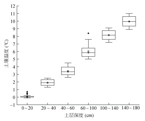在东北农业大学试验场设置了土壤温度观测点,测定设备为土壤温湿度传感器(ET100,北京东方生态,中国),测定深度为0 ~ 20、20 ~ 40、40 ~ 60、60 ~ 100、100 ~ 140、140 ~ 180 cm土层深度的温度。除此之外,地块还设置冻土器用来监测土壤冻结深度变化情况,通过人工测量的方式来获取具体数据。