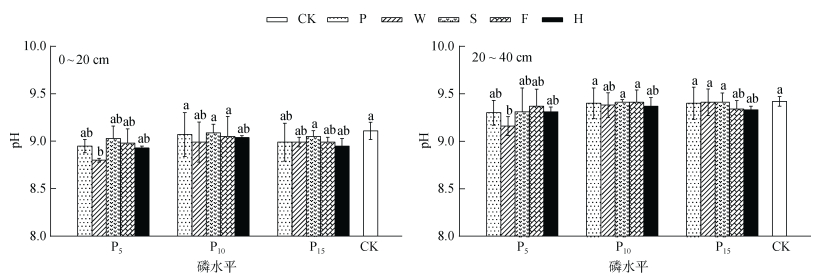 各处理0 ~ 20 cm土壤pH为8.80 ~ 9.11,P5W处理显著低于CK处理3.40%,其他处理较CK处理下降0.22% ~ 1.98%;各处理20 ~ 40 cm土壤pH为9.16 ~ 9.42,P5W处理显著低于CK处理2.76%,其他处理较CK处理下降0.11% ~ 1.27%;土壤pH表现为随深度增加而增加。各处理0 ~ 20 cm和20 ~ 40 cm土壤的电导率和CK处理相比,差异均不显著。