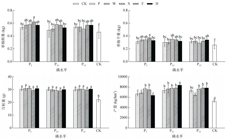 磷肥和生物质改良剂配施不同程度上促进玉米干物质积累,增加籽粒饱满度及玉米产量(图 2)。不同磷肥水平和生物质改良剂处理均增加玉米单株鲜重和干重,分别较CK处理增加6.52% ~ 34.78% 和11.54% ~ 42.31%。磷肥和生物质改良剂能显著增加玉米百粒重和产量,较CK处理分别增加31.15% ~ 40.52% 和21.81% ~ 60.02%。施磷量对百粒重有极显著影响,对产量表现为先增大后减小的趋势。CK处理百粒重最低为22.09 g,各磷肥配施生物质改良剂处理百粒重较CK处理增加31.15% ~ 40.52%。CK处理产量最低,为5 233.25 kg/hm2,各磷肥配施生物质改良剂处理产量较CK处理增产21.81% ~ 60.02%。