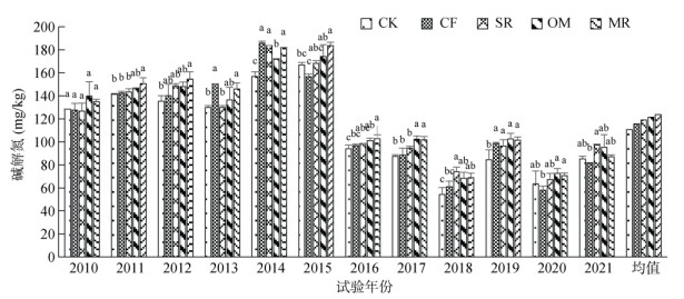 (图中不同小写字母表示同一年份不同处理间差异在P < 0.05水平显著,下同) 图 1 不同处理土壤碱解氮含量 Fig. 1 Soil alkali-hydrolyzable N contents under different treatments |