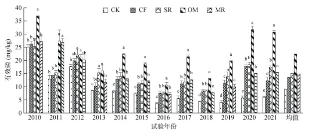 与初始土壤养分含量(2010年CK处理)相比,2021年CK、CF、SR、OM、MR处理碱解氮含量分别减少了33.56%、36.48%、24.25%、25.84%、32.12%。但观察历年土壤的碱解氮含量,可以发现目前土壤碱解氮含量均低于初始含量应是由于外部因素影响带来的氮素流失导致,且历年土壤碱解氮含量呈上升趋势,说明试验土壤的氮素施肥充足且不过量(图 1)。