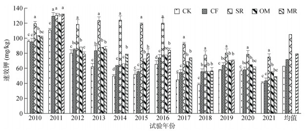2.3 长期定位试验土壤的速效钾含量对于长期定位试验中土壤速效钾均值的提升,与CK处理相比,CF处理增加了13.45%,SR处理增加了69.41%,OM处理增加了25.92%,MR处理增加了27.85%;而与CF处理相比,SR处理增加了49.32%,OM处理增加了10.99%,MR处理增加了12.69%(表 2)。表明秸秆还田对土壤钾素的提升非常显著,而有机肥配施与紫云英类绿肥还田的肥效则高于单施化肥但远低于秸秆还田。