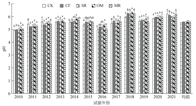2.4 长期定位试验土壤的有机质含量对于长期定位试验中土壤有机质均值的提升,与CK处理相比,CF处理增加了3.14%,SR处理增加了10.78%,OM处理增加了10.56%,MR处理增加了9.38%;而与CF处理相比,SR处理增加了7.41%,OM处理增加了7.19%,MR处理增加了6.05%(表 2)。表明有机物料的施用均能提高土壤有机质含量,且优于单施化肥。