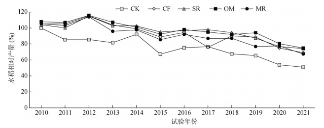(图中相对产量是以2010年CK处理的水稻产量作为100% 进行换算) 图 6 长期定位试验小区水稻的相对产量 Fig. 6 Annual rice relative yields in the long-term located test plot |