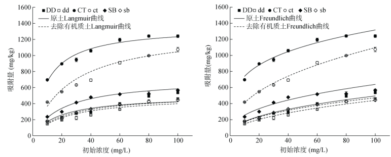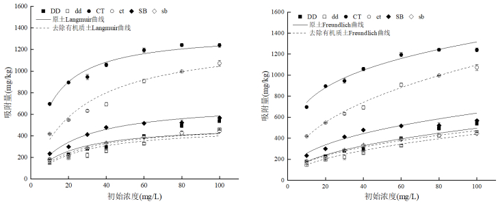 (左图:Langmuir拟合:右图:Freundlich拟合) 图 1 原土与去除有机质土对Se(Ⅳ)吸附的等温曲线拟合 Fig. 1 Isothermal curves fitting for Se (Ⅳ) adsorption by original soil and soil with organic matter removed |