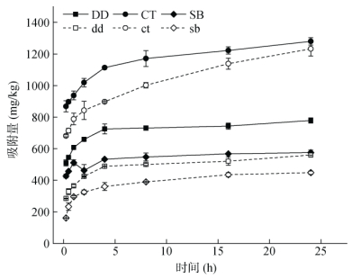 如图 4所示,土壤的Se(Ⅳ)解吸量随初始Se(Ⅳ)浓度的增加而上升,但解吸率变化无统一规律。在Se(Ⅳ)初始浓度为100 mg/L时,DD、CT和SB的解吸量分别为37.74、27.55和60.23 mg/kg,解吸率分别为7.04%、2.22%和1.94%;去除有机质后,Se(Ⅳ)解吸量也随初始浓度上升而增加,dd、ct和sb解吸量分别为10.85、21.92、30.25 mg/kg,解吸率分别为2.52%、2.04% 和1.36%。可以发现,土壤中的Se(Ⅳ)一旦被吸附就很难释放,说明吸附过程主要以胶体表面与离子之间的专性作用力产生的专性吸附为主[20],因其土壤胶体成分与Se(Ⅳ)通过化学键结合,化学键较难破坏,所以被吸附的Se(Ⅳ)较难被解吸[21],解吸出的Se(Ⅳ)主要来自更易释放的非专性吸附过程。去除有机质后,土壤的Se(Ⅳ)解吸量和解吸率均显著下降,原因可能是有机质的存在虽然能促进土壤对Se(Ⅳ)的吸附,但也促进了土壤中部分结合硒的释放,说明有机质对土壤吸附Se(Ⅳ)具有两面性[22]。也可能是矿物中与有机物结合的吸附位点因有机质的去除而被释放,矿物对Se(Ⅳ)的吸附作用力增强,导致去除有机质后Se(Ⅳ) 解吸量和解吸率的减少[23]。