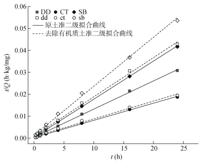 5种动力学模型拟合土壤吸附Se(Ⅳ)的结果如表 4所示,可以发现,Elovich模型、双常数模型、准一级动力学和准二级动力学模型对其拟合效果较好。抛物线模型的拟合效果较差,Qt与t0.5并未呈良好的线性关系,且拟合曲线不经过原点,说明Se(Ⅳ)吸附除颗粒内部扩散外,还伴随着其他的吸附机制。根据拟合系数R2判断,准二级动力学方程是最适合描述富硒赤红壤吸附Se(Ⅳ)过程的模型,线性关系较好(图 3),相关系数为0.985 2 ~ 0.998 69,说明土壤对Se(Ⅳ)的吸附速率由化学反应和通过电子共享或得失为基础的化学吸附所控制。由表 4还可以看出,去除有机质后,吸附模型拟合结果中Qe2与k2值均显著下降,说明随时间变化,去除有机质后土壤对Se(Ⅳ)的吸附容量与吸附强度均显著下降。与图 2的结果相比,模型拟合得到的平衡吸附量与实际观察到的结果接近,说明拟合效果较好。