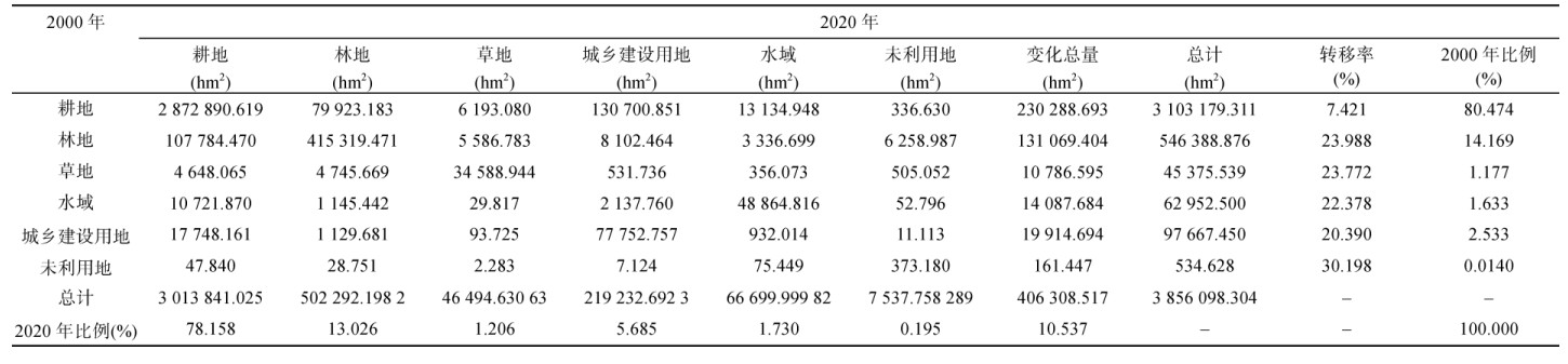 表 2 2000—2020年土地利用转移矩阵 Table 2 Land use transfer matrix from 2000 to 2020 |
