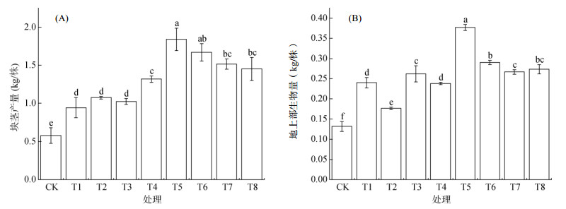 图 3 不同施肥处理对菊芋块茎产量(A)和地上部生物量(B)的影响 Fig. 3 Jerusalem artichoke tuber yields(A)and aboveground fresh mass(B) under different fertilization |