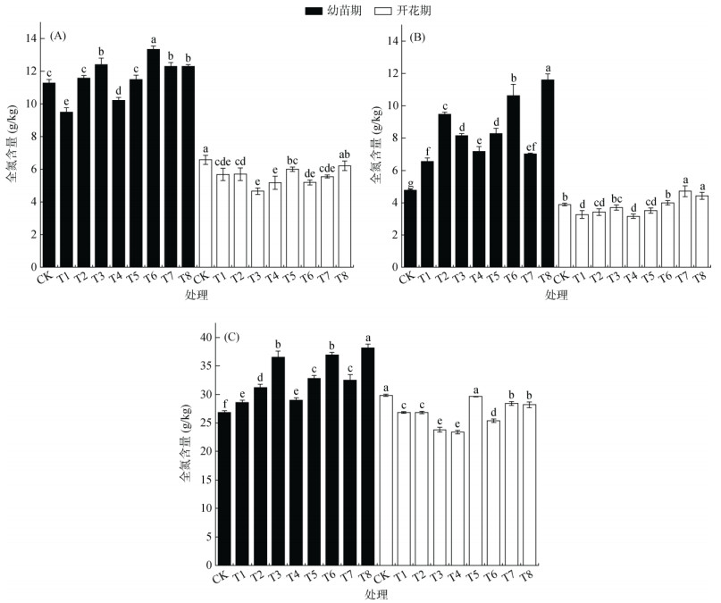 在幼苗期,T6处理根的全氮含量最高,为13.35 g/kg,较CK处理显著增加18.34%;T8处理茎和叶的全氮含量均最高,分别为11.61 g/kg和38.16 g/kg,较CK处理分别显著增加142.60% 和42.19%(P < 0.05)。在开花期,绝大多数施肥处理根和叶的全氮含量显著小于CK处理(P < 0.05),但T5处理叶的全氮含量和T8处理根的全氮含量与CK处理差异不显著。