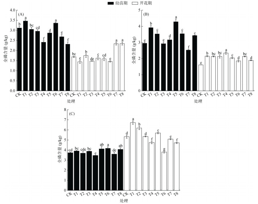 在幼苗期,T1处理根的全磷含量最高,为3.46 g/kg,较CK处理显著增加11.07%(P < 0.05);T5处理茎的全磷含量最高,为4.28 g/kg,较CK处理显著增加45.04%(P < 0.05);T5、T6和T8处理叶的全磷含量较高,分别为4.12、4.18和4.07 g/kg,较CK处理分别显著增加10.05%、11.76% 和8.74%(P < 0.05),而3处理间差异不显著。在开花期,T8处理根的全磷含量最高,为2.35 g/kg,较CK处理显著增加38.92% (P < 0.05);T4处理茎的全磷含量最高,为2.34 g/kg,较CK处理显著增加45.34%(P < 0.05);T1处理叶的全磷含量最高,为6.72 g/kg,较CK处理显著增加26.27% (P < 0.05)。