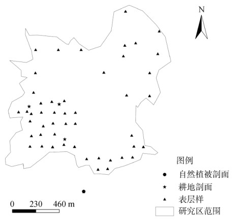1.2 样品采集与测定本研究以100 m×100 m的方形网格进行布点采样,依据《土壤环境监测技术规范》[14]共采集研究区内耕地表层土壤样品48个和剖面样品4个(包括1个自然植被土壤剖面和3个耕地土壤剖面),采样点分布如图 1所示。耕地表层样品采用五点混合法取0 ~ 20 cm表层土样,剖面采样深度自然剖面为1.2 m,耕地剖面为2.0 m,间隔20 cm取样。土壤样品于室外通风干燥处自然风干,剔除杂物后研磨过20目尼龙筛,混匀备用。另取出部分样品继续研磨过100目尼龙筛,混匀备测。