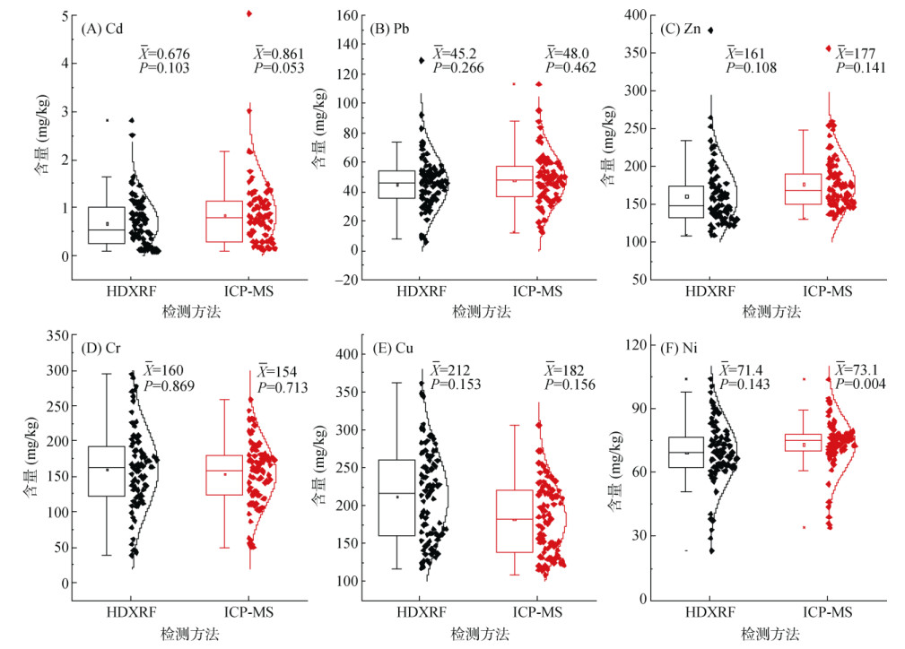 本研究使用的HDXRF仪型号为E-max500 (西安佳谱电子科技有限公司),与传统能量色散X荧光光谱(EDXRF)相比,检测性能显著提升,可快速准确定量分析土壤中Cd等重金属元素,0.05 mg/kg检出限可应对Cd的农用地土壤污染风险管控标准[17]中最低限值0.3 mg/kg的要求,其他金属检出限也远高于标准限值的要求。ICP-MS (iCAP RQ/S-475,美国赛默飞世尔科技有限公司)是通过前期加入混合酸溶液,以加热方式消解有机物和无机物,将不同价态的重金属变为离子态转移到溶液中进行测定[18]。两种检测仪器重金属检出限见表 1。