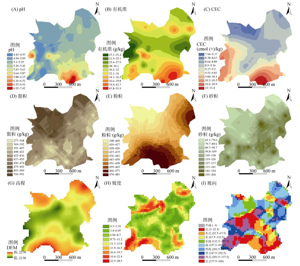图 5 研究区地形特征及土壤理化指标空间分布 Fig. 5 Spatial distributions of topographic characteristics and soil physicochemical indexes in study area |