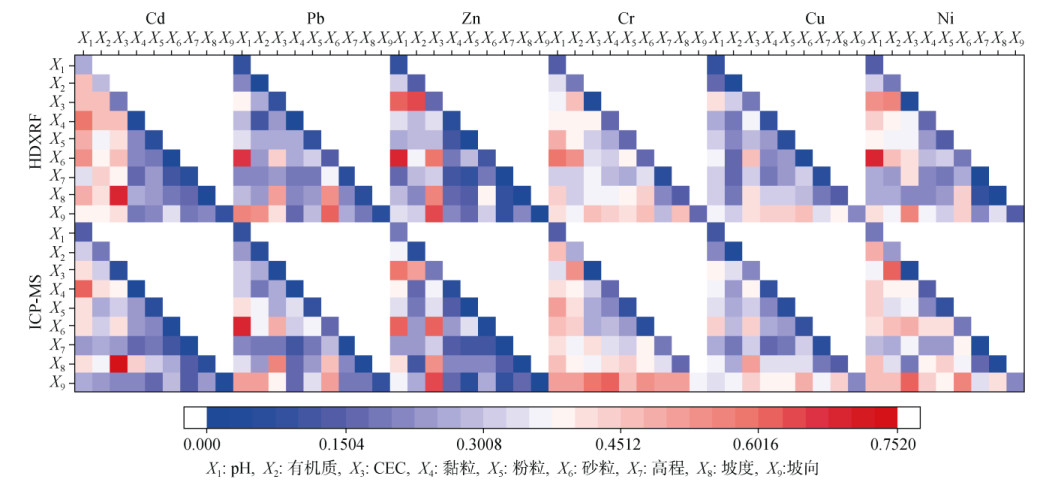 其中,土壤重金属(Cd、Pb、Zn、Cr、Cu、Ni)全量同时采用HDXRF法及ICP-MS法测定;pH采用离子选择电极法测定;有机质采用重铬酸钾容量法测定;阳离子交换量(CEC)采用氯化六氨合钴浸提–分光光度法(HJ 889—2017)测定[15],该方法测定的CEC为有效态阳离子交换量;土壤粒度组成采用Mastersizer 2000激光粒度仪检测。样品分析质量控制措施包括采取空白样、平行样,插入标准物质等。试验所用试剂和药品纯度均满足试验要求。另外,研究所用地形因子数据(坡度、坡向、高程)通过地理空间数据云(http://www.gscloud.cn/)获取。