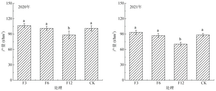 在ADF处理下,F3与F6处理番茄产量无显著性差异,但它们均显著高于F12处理(图 5),其中F6比F12处理两年平均产量高22.6%。相同施肥量和滴灌施肥频率下,F6处理灌水量减少40% 的同时能够保持与CK相当产量。