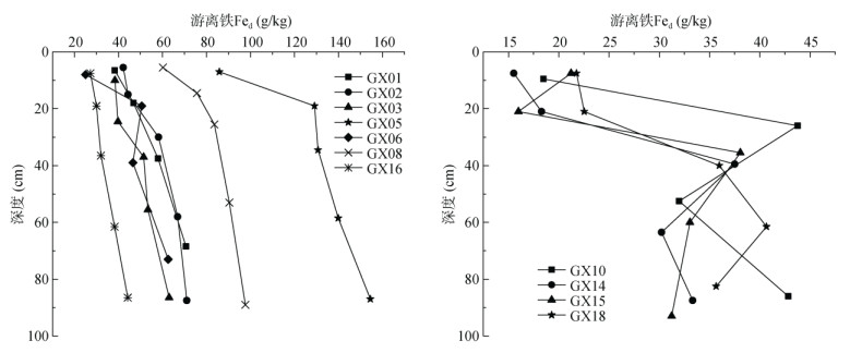 GX01、GX02、GX03、GX06、GX07、GX09、GX16、GX18、GX19由于人为复石灰(复钙作用)产生或深或浅的钙积现象,对铁的向下淋溶淀积有一定程度的阻碍,因此,游离铁含量由上至下体现为增加不明显或无变化。