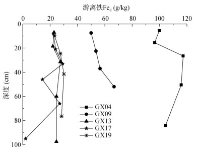 2.1.3 氧化铁的分布特征土壤氧化铁在干湿交替条件下还原淋溶和氧化淀积的迁移,改变了水稻土铁的分布特征,反映水稻土的成土过程。本研究剖面的耕层土壤游离铁含量在12.31 ~ 99.87 g/kg。从沿剖面垂直分布来看,80% 的剖面土壤游离铁含量随土壤深度增加,有从表层向底土层增加或先增后减的趋势,这是水稻土淹水时氧化铁的还原淋溶和排水落干后氧化淀积共同作用的结果[15]。80% 的剖面土壤游离铁含量以耕层(Ap1) 和犁底层(Ap2)较低,向下呈现增加的趋势。GX01、GX02、GX03、GX05、GX06、GX08、GX10、GX14、GX15、GX16、GX18、GX20水耕氧化还原层的游离铁含量介于30.23 ~ 154.51 g/kg,是耕作层Ap1的1.50倍~ 2.50倍,均大于1.5倍,故具有明显的铁聚特征[12]。
