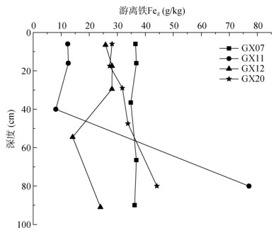 11个铁聚水耕人为土剖面中游离铁含量表现为由上至下增加或先增后减趋势,但最终与水耕表层相比均为增加(图 1)。GX10、GX14、GX15、GX18游离铁表现出由上至下陡增的特点,其铁聚特征尤其明显,原因与土壤熟化程度高、土壤结构发育良好、通透性优良、排水落干后铁的顺利氧化淀积有关。5个简育水耕人为土游离铁含量除GX04有稍微明显的铁氧化淀积现象外,其余剖面变化不明显(图 2)。潜育水耕人为土的GX12游离铁在潜育层减少的幅度较明显(图 3),这是地下水位高使水分饱和土壤呈还原状态和钙积层的存在使土壤通透性恶化共同作用的结果;而其余3个潜育水耕人为土游离铁含量表现为先在潜育层小幅度减少再在下土层或母质层增至最高。