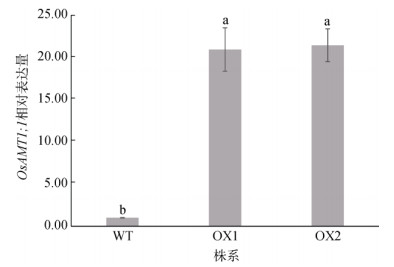 (柱图上方不同小写字母表示不同株系间差异显著(P < 0.05)) 图 1 过表达株系的OsAMT1;1表达水平 Fig. 1 OsAMT1;1 expression level of overexpression lines |