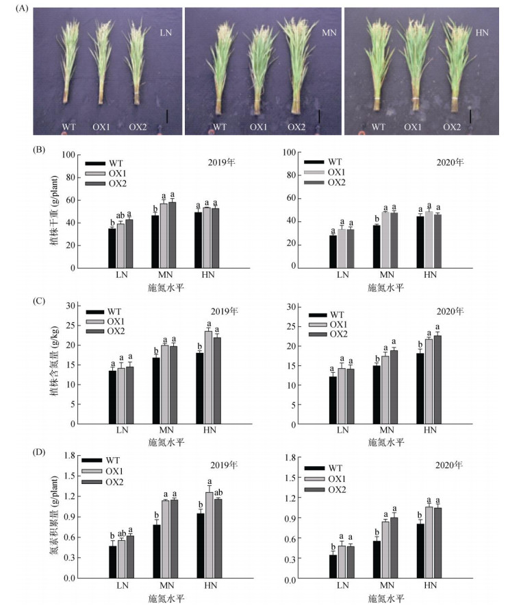 (图A为野生型植株与OsAMT1;1过表达植株在灌浆期的代表性照片,来自2019年的田间试验,Bar=1 dm;图B~图D中柱图上方不同小写字母表示同一施氮水平下不同植株间差异在P < 0.05水平显著;下同) 图 2 过表达OsAMT1;1对灌浆期植株生长和地上部氮素积累的影响 Fig. 2 Effects of OsAMT1;1 overexpression on plant growth and shoot nitrogen accumulation at grain filling stage |