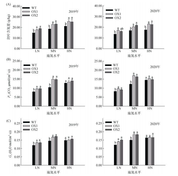 在灌浆期,随着施氮水平的增加,WT和OsAMT1;1过表达株系剑叶含氮量有明显变化(图 3A)。在LN、MN、HN条件下,OsAMT1;1过表达株系剑叶含氮量较WT均有显著的增加,分别平均增加22.98%、24.3%和24.82%。而随着施氮水平的增加,OsAMT1;1过表达株系剑叶净光合速率(Pn,图 3B)和气孔导度(Gs,图 3C)表现出先升高后略微降低的趋势。在MN条件下,OsAMT1;1过表达株系剑叶Pn和Gs较WT分别平均增加40.71% 和19.39%,差异显著;在HN条件下,OsAMT1;1过表达对剑叶Pn和Gs的作用减弱(与MN处理相比)。综合可见,在HN条件下,OsAMT1;1过表达株系Pn和Gs对施氮水平的响应程度比基因本身更敏感。